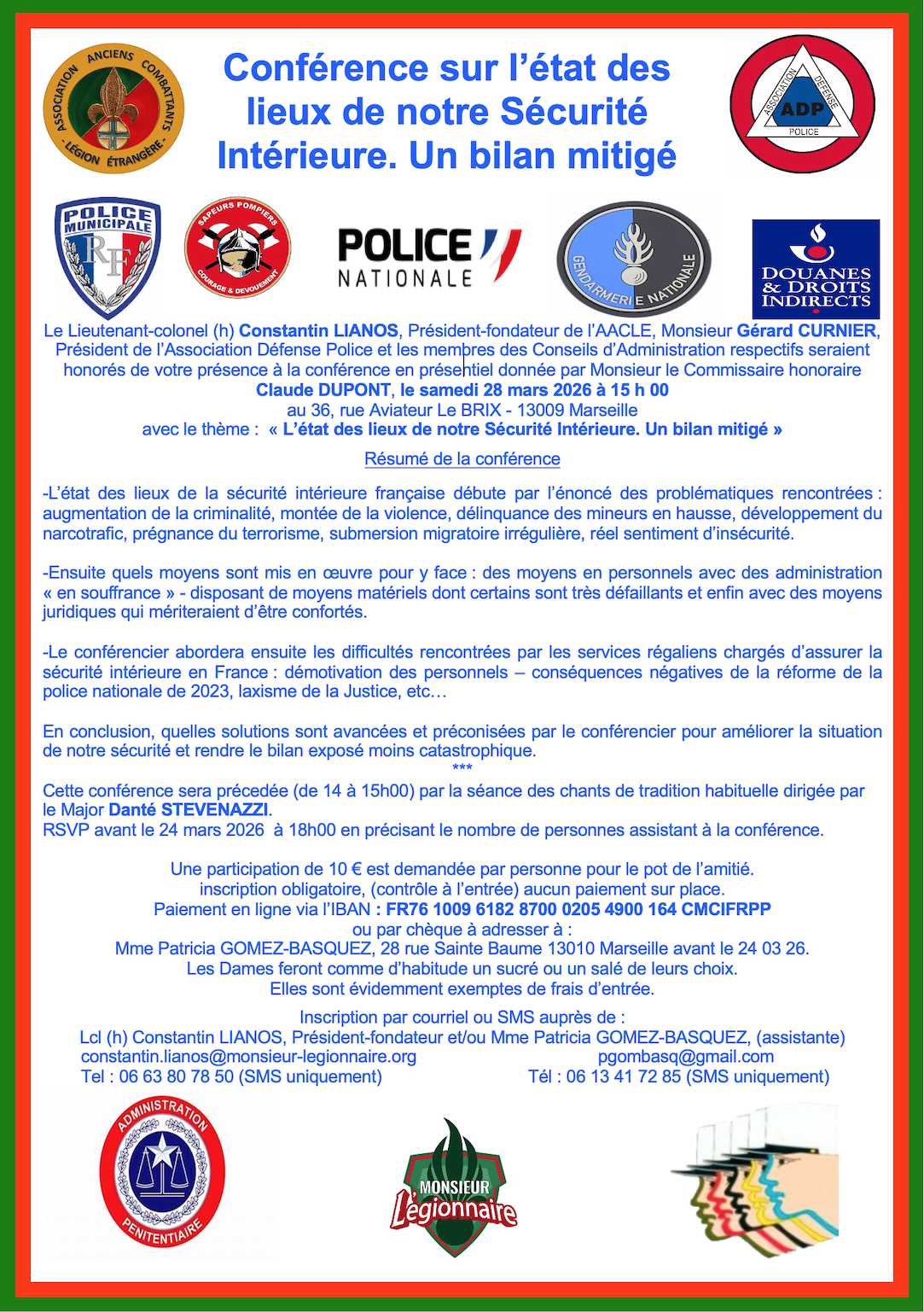 Le Lieutenant-colonel (h) Constantin LIANOS, Président-fondateur de l’AACLE, Monsieur Gérard CURNIER, Président de l’Association Défense Police et les membres des Conseils d’Administration respectifs seraient honorés de votre présence à la conférence en présentiel donnée par Monsieur le Commissaire honoraire Claude DUPONT, le samedi 28 mars 2026 à 15 h 00