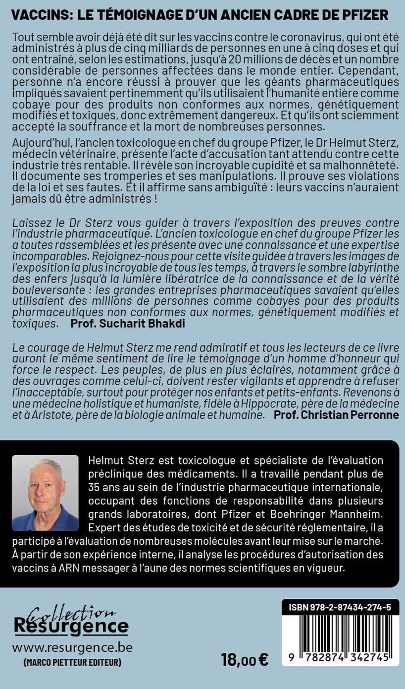 Le hasard de l’histoire l’a conduit à travailler au sein du laboratoire Pfizer en France, à Amboise, mais quand la crise Covid-19 éclata, il était à la retraite. Il a suivi ébahi le développement d’une thérapie génique expérimentale sortie du chapeau en quelques semaines, utilisant une nouvelle technologie non éprouvée, censée sauver l’humanité d’une menace plandémique due à un coronavirus tout nouveau, fraichement sorti des laboratoires, le SARS-CoV-2, responsable d’une maladie dénommée à la hâte Covid-19. Et là, ce scientifique rigoureux, à l’éthique chevillée au corps, va aller de surprise en surprise, qu’il nous révèle dans ce livre très bien documenté, courageux et passionnant. Tout le développement de ce pseudo-vaccin s’est fait dans des conditions totalement illégales, sans respecter les études préliminaires indispensables pour vérifier la bonne tolérance du produit. Une pandémie de mensonges et de dissimulations a touché moult politiciens, industriels, médecins, universitaires, rédacteurs de revues scientifiques et bien entendu, journalistes aux ordres et autres redresseurs de faits, les fameux « fact-checkers ». Le courage de Helmut Sterz me rend admiratif et tous les lecteurs de ce livre auront le même sentiment de lire le témoignage d’un homme d’honneur qui force le respect. Les peuples, de plus en plus éclairés, notamment grâce à des ouvrages comme celui-ci, doivent rester vigilants et apprendre à refuser l’inacceptable, surtout pour protéger nos enfants et petits-enfants.