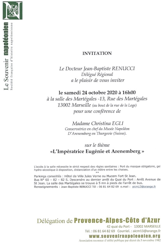 J'ai le plaisir de vous confirmer le programme de la prochaine conférence du samedi 24 octobre 2020 au cours de laquelle Madame Christina EGLI nous rappellera l'histoire de l'Impératrice Eugénie à Arenemberg à l'occasion du 100ème anniversaire de sa disparition.