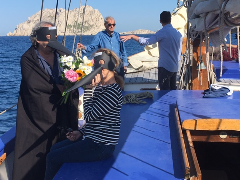 Mais, enfin, ce matin tout change. La Flâneuse garnit sa proue d’un sourire qu’il n’est pas difficile de deviner à défaut de le voir. Son étrave embrasse à nouveau la mer. Ce 28 mai, tout est à l’unisson : les flots, le ciel et l’équipage. Bruno reçoit à son bord deux journalistes de TF1 venant réaliser un reportage sur la Peste de 1720. Michel Goury, incontournable en la matière, inventeur de l’ancre du Grand Saint-Antoine et auteur de l’ouvrage Un homme, un navire - La Peste de 1720 – Aquarelles de Jean-Marie Gassend – préface de Gilbert Buti (Ed Jeanne Laffitte 2013) est naturellement présent. Michel allait être interviewé. Pour compléter l’équipage, deux femmes : Florence et Marie-Claire ; un plongeur professionnel, Denis et moi-même.