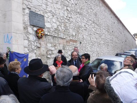 Dévoilement de la gerbe de fleurs en l'honneur des marseillais bâtisseurs du rempart par la présidente Alice Faure en présence du docteur Annie Levy-Mozziconacci (élue)