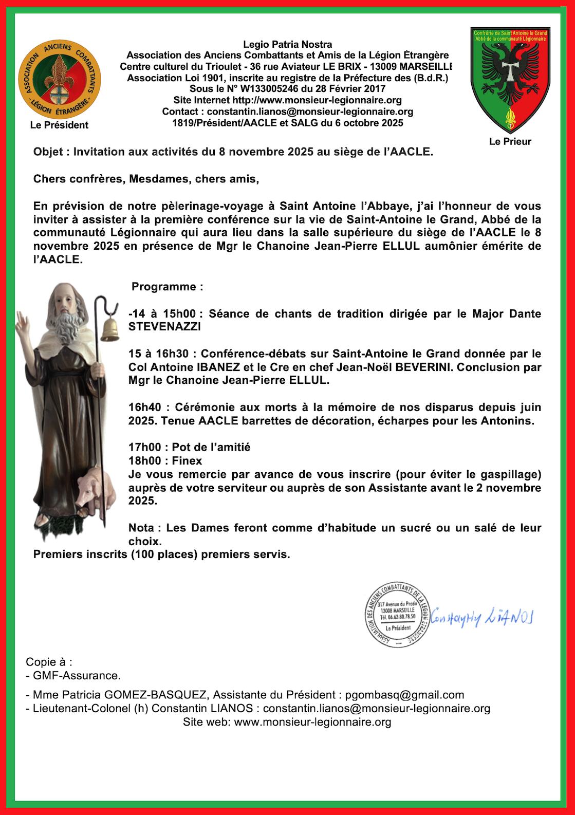 8 novembre 2025 : Conférence-débats sur Saint-Antoine le Grand donnée par le Col Antoine IBANEZ et le Cre en chef Jean-Noël BEVERINI. Conclusion par Mgr le Chanoine Jean-Pierre ELLUL