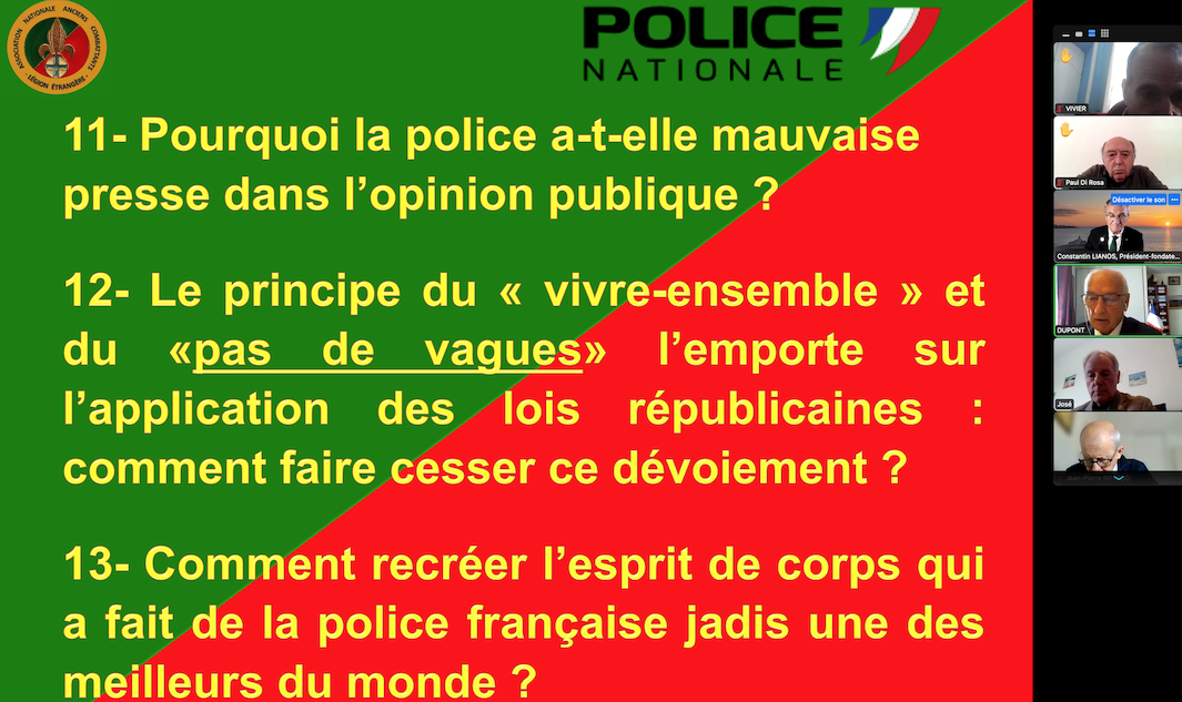 C’est pour répondre à ces questions capitales que le lieutenant-colonel Constantin Lianos, président de l’association des anciens combattants et amis de la Légion Etrangère, a invité pour une visio-conférence internationale un expert reconnu de la sécurité : le commissaire divisionnaire honoraire Claude Dupont qui fit une brillante carrière à Marseille, à Nice et en Afrique. Ce haut-fonctionnaire a su relater avec précision l’histoire de notre police depuis sa création et sa conférence très complète a été magistrale. Mais à l’impossible nul n’est tenu : la police n’est pas la seule responsable de sa lente déliquescence.
